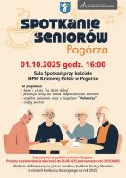 WięcejRzymskokatolicka Parafia NMP Królowej Polski w Pogórzu wraz z Sołtysem i Radą Sołecką zaprasza seniorów na spotkanie w Sali Spotkań przy kościele. W programie: kawa i ciasto, prelekcja policji o bezpieczeństwie, wspólne śpiewanie z zespołem „Maliniorze” oraz ciepły posiłek. Prosimy o potwierdzenie udziału do 26.09.2025 pod numerem 505 938 805.