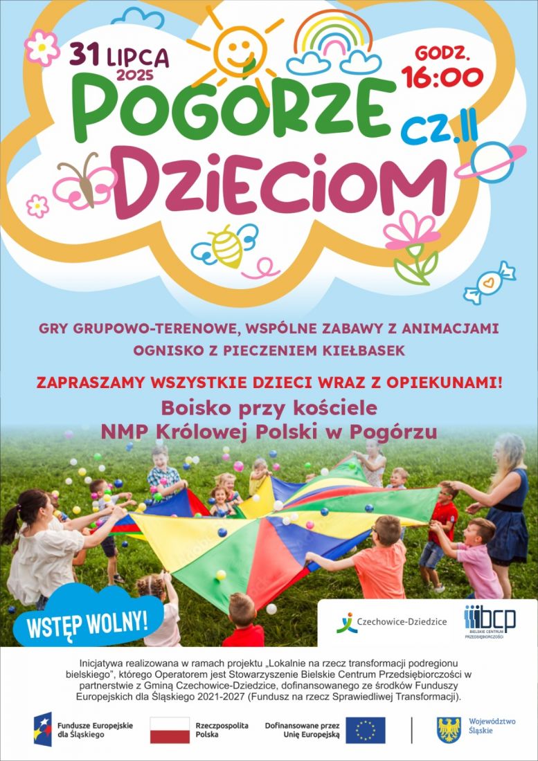Grupa Inicjatywna "Pogórze Dzieciom", serdecznie zaprasza wszystkie Dzieci wraz z Opiekunami dnia 31 lipca 2025r. o godz. 16:00 na boisko przy kościele NMP Królowej Polski w Pogórzu na gry grupowo-terenowe, zabawy z animacjami i ogisko z pieczeniem kiełbasek. Wstęp wolny. Serdecznie zapraszamy 🥰